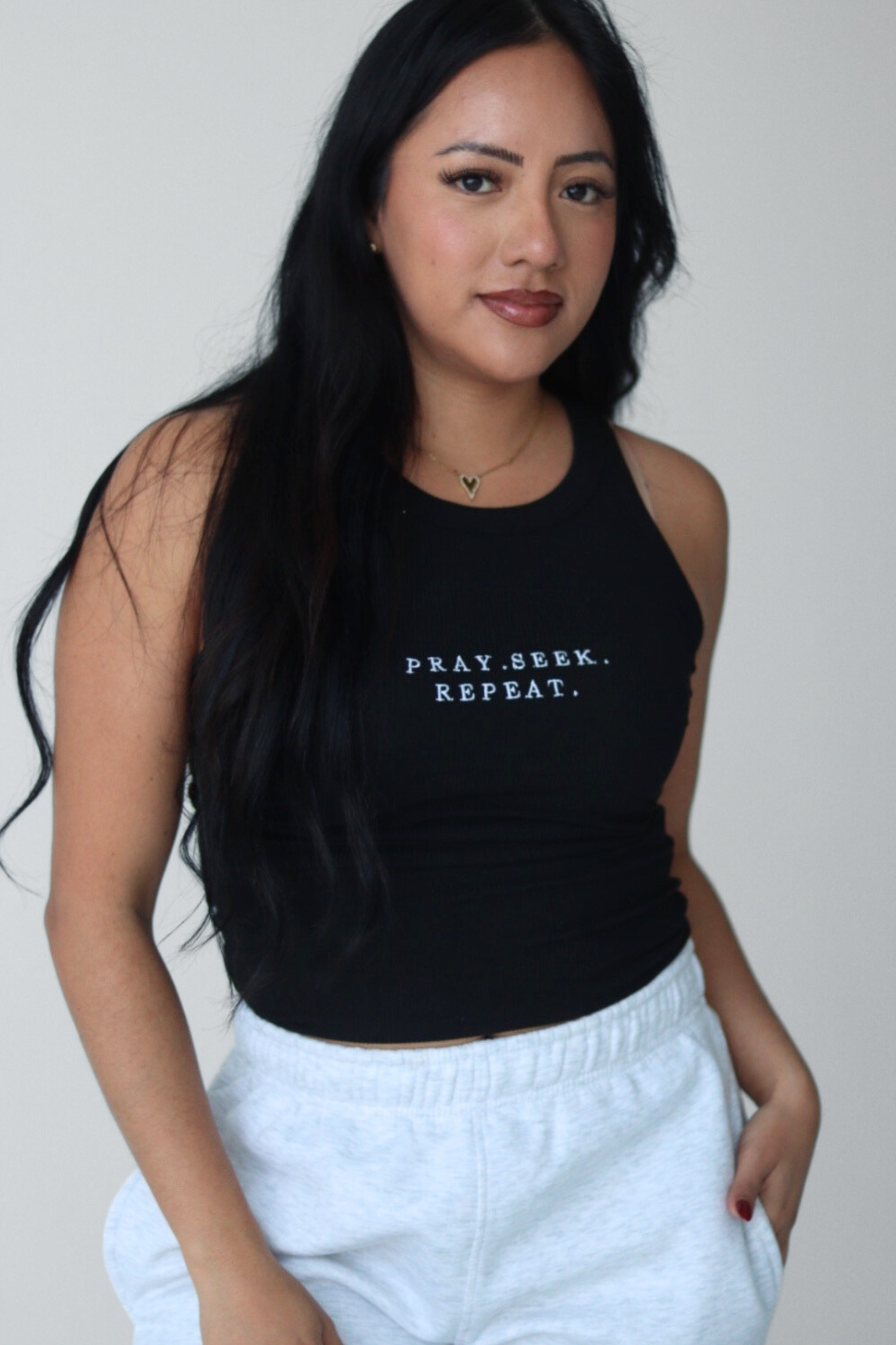 The Pray. Seek. Repeat. Tank is designed with a supportive stretch blend that moves with you while keeping its shape. Unlike loose jersey cotton, this fabric offers a light compression feel, soft against the skin, breathable, and perfect for layering or wearing on its own. Embroidered with our signature phrase across the chest, it’s made to remind you of your daily pursuit in Christ while giving you a fit that feels as good as it looks.