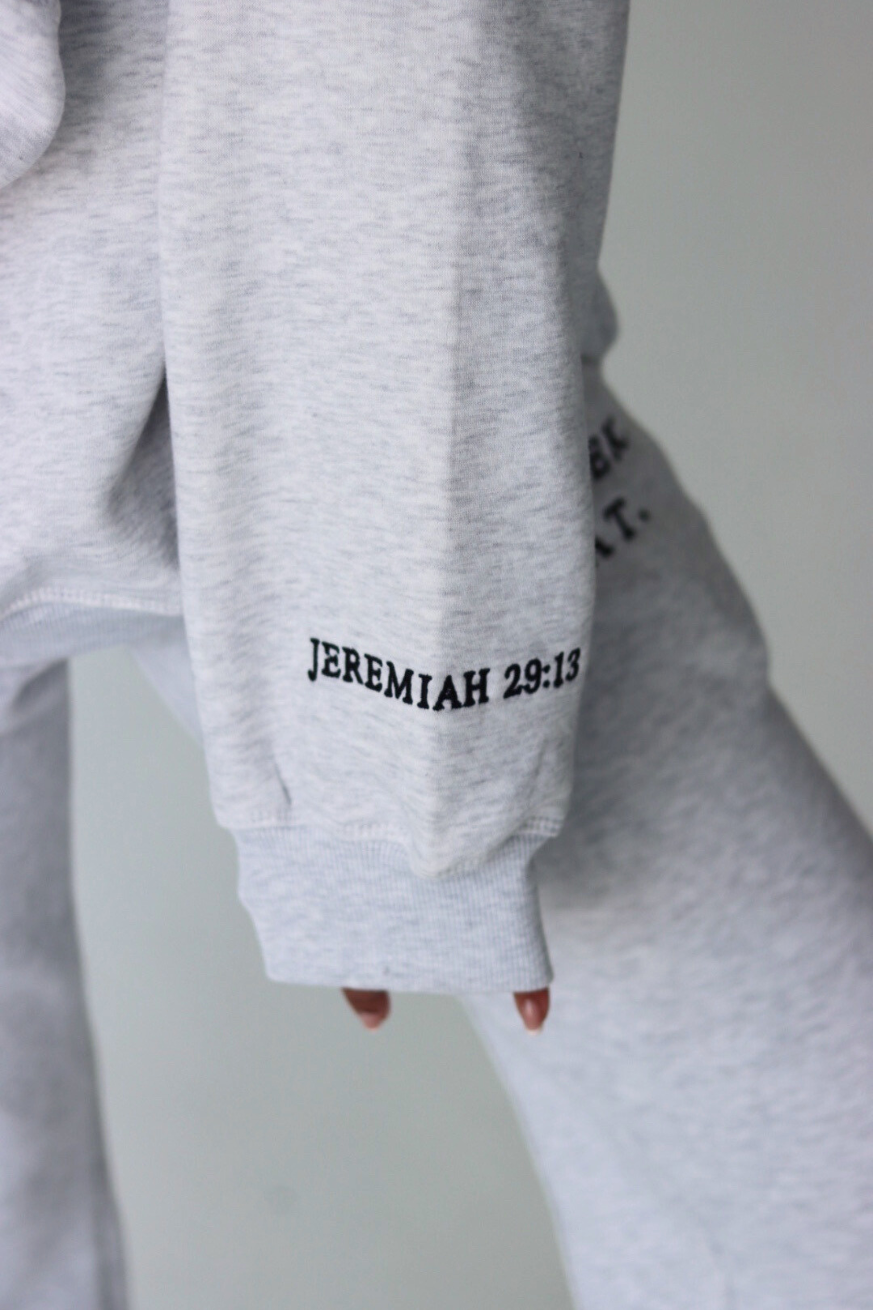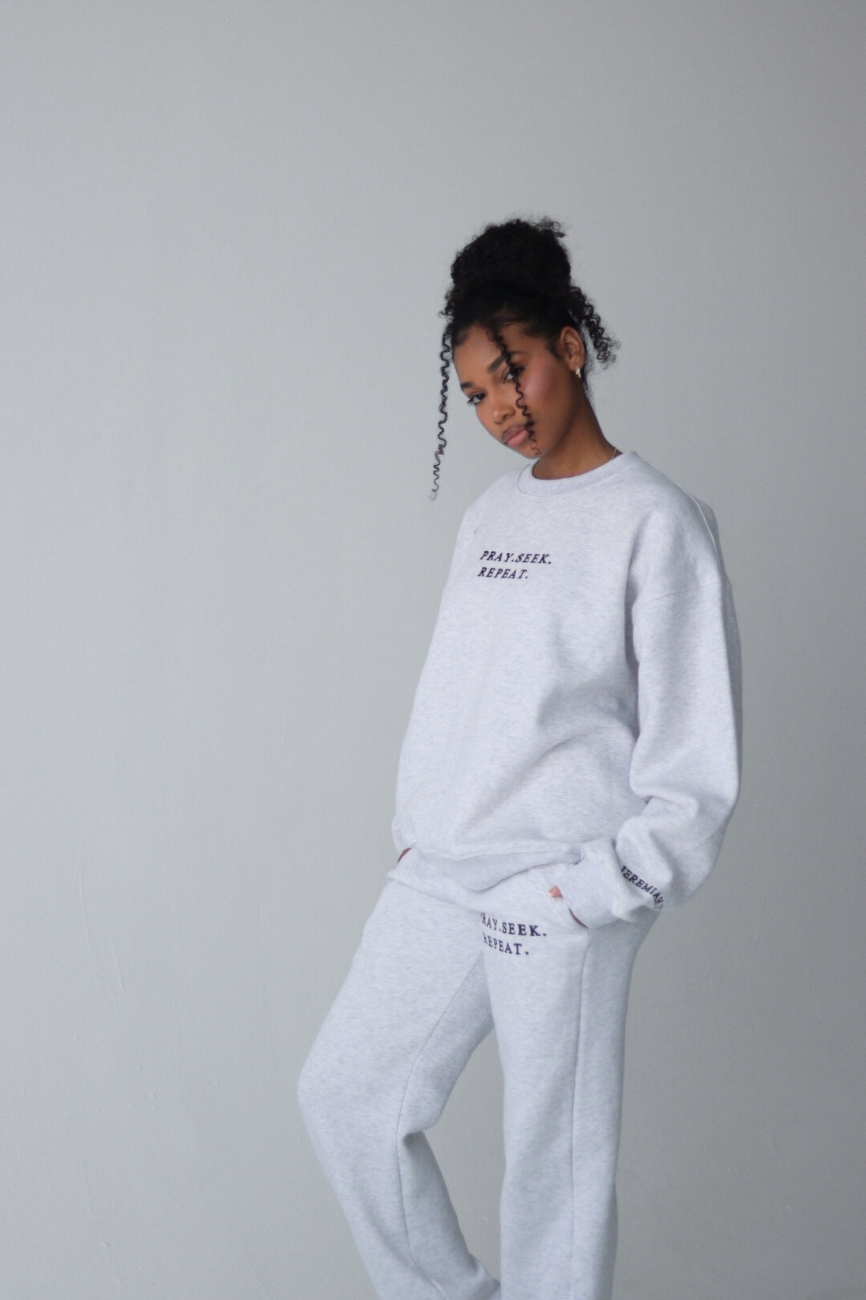 The #PSRPullover returns. Go from your prayer closet to running errands with ease in our PSR crewneck. Featuring our premium embroidered Pray Seek Repeat and Jeremiah 29:13 sleeve design. Pair with our #PSRjogger or biker shorts for a relaxed look.